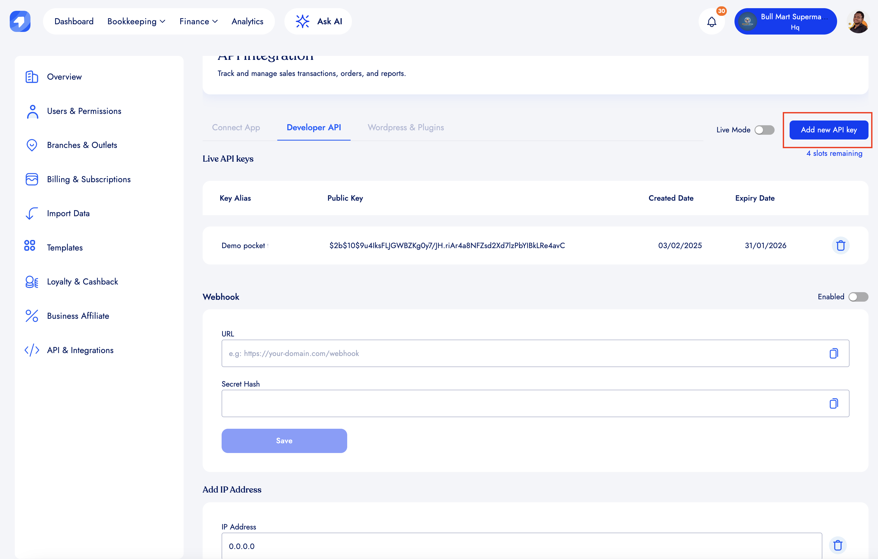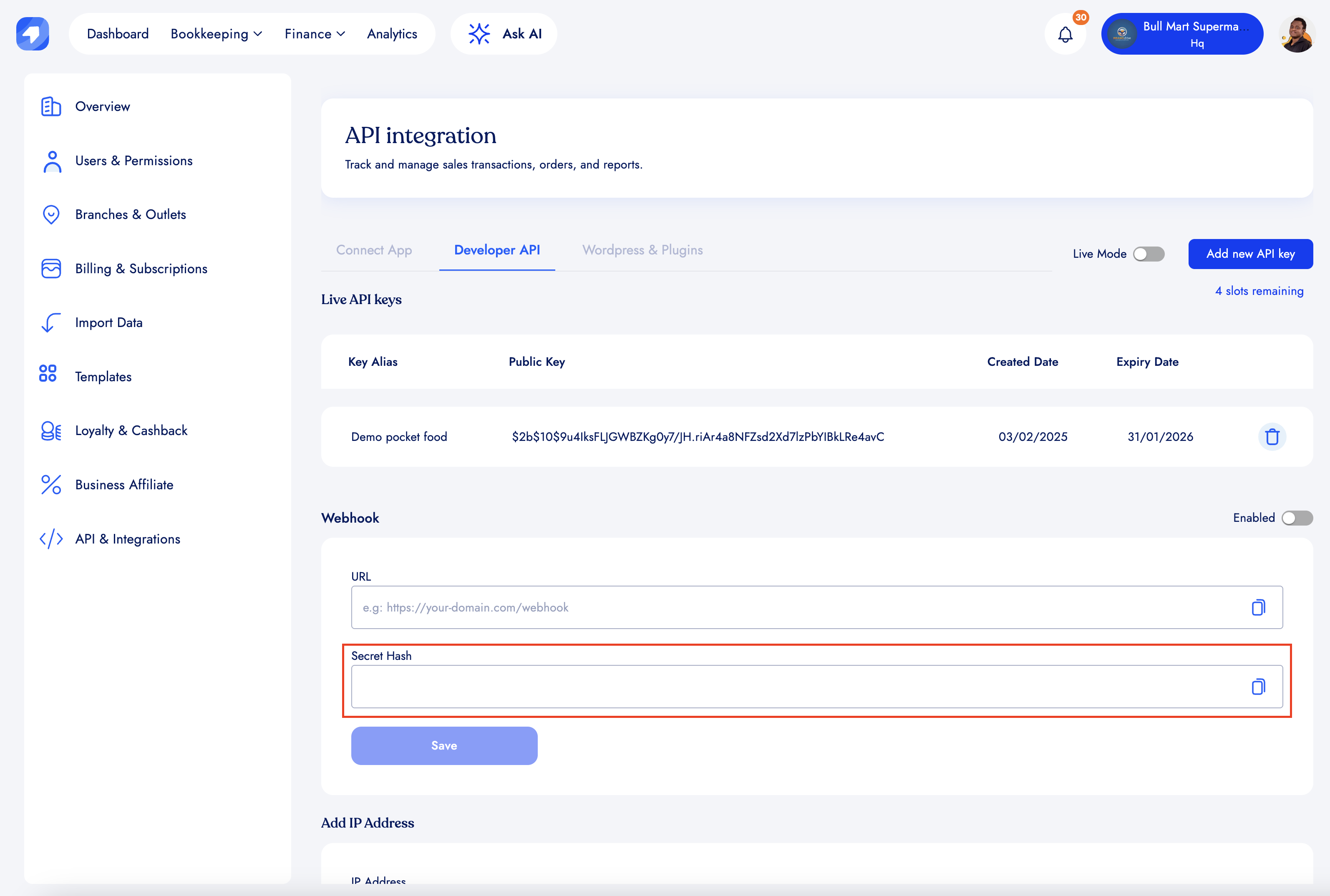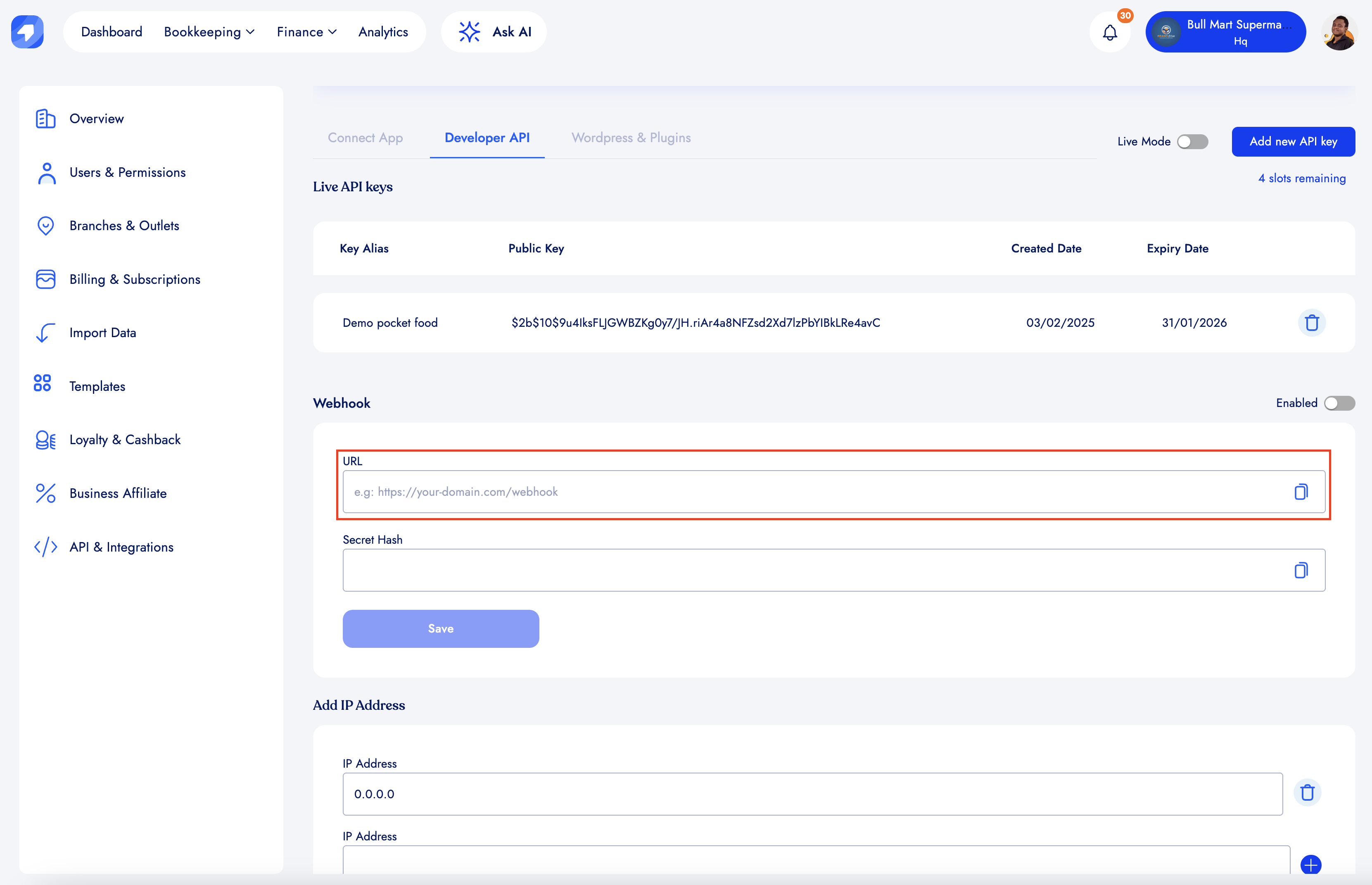 Before enabling or adding a web-hook URL, make sure you have created an API key.