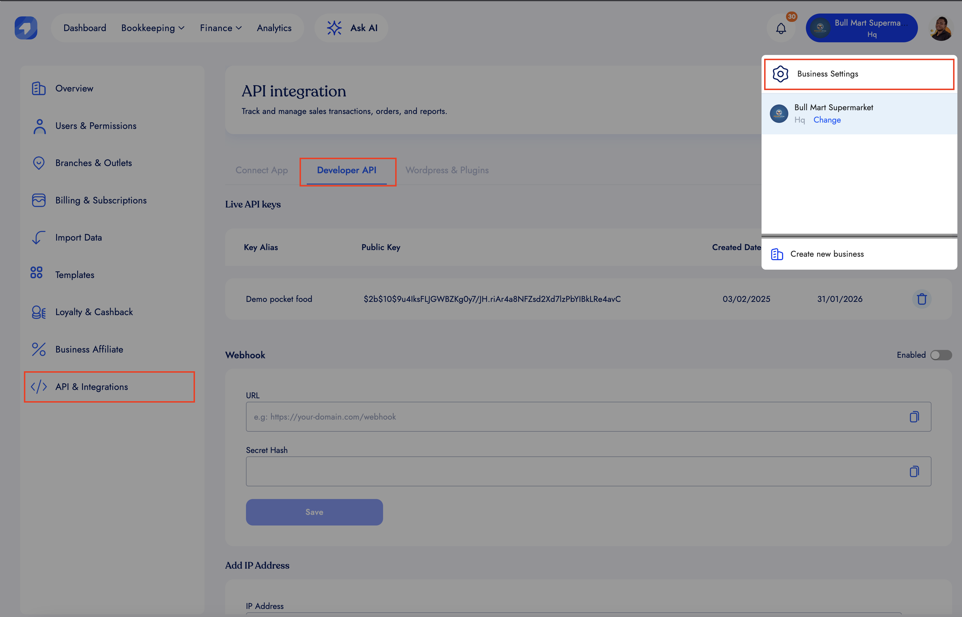 First, go to the settings menu and locate the developer API section.